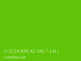 XYZ 24.839,42.439,7.141 Color is a normal green color and the nearest color is Kelly Green #4cbb17. Hex code #60c509 and RGB value is rgb(96,197,9). In RGB color space, this color is composed of 38% red, 77% green, 4% blue, In CMYK color space, this color is composed of 51% cyan, 0% magenta, 95% yellow , 23% black , In HSL color space, this color has a hue angle of 92° , 91% saturation and 40% lightness.