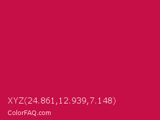 XYZ 24.861,12.939,7.148 Color is a normal rose color and the nearest color is Pictorial Carmine #c30b4e. Hex code #c70f47 and RGB value is rgb(199,15,71). In RGB color space, this color is composed of 78% red, 6% green, 28% blue, In CMYK color space, this color is composed of 0% cyan, 92% magenta, 64% yellow , 22% black , In HSL color space, this color has a hue angle of 342° , 86% saturation and 42% lightness.