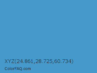 XYZ 24.861,28.725,60.734 Color is a normal blue color and the nearest color is Celestial Blue #4997d0. Hex code #469acb and RGB value is rgb(70,154,203). In RGB color space, this color is composed of 27% red, 60% green, 80% blue, In CMYK color space, this color is composed of 66% cyan, 24% magenta, 0% yellow , 20% black , In HSL color space, this color has a hue angle of 202° , 56% saturation and 54% lightness.