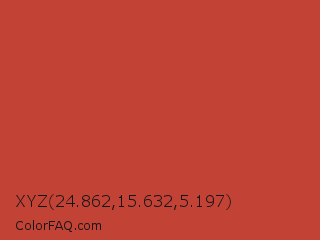 XYZ 24.862,15.632,5.197 Color is a normal red color and the nearest color is Mojo #c04737. Hex code #c24236 and RGB value is rgb(194,66,54). In RGB color space, this color is composed of 76% red, 26% green, 21% blue, In CMYK color space, this color is composed of 0% cyan, 66% magenta, 72% yellow , 24% black , In HSL color space, this color has a hue angle of 5° , 56% saturation and 49% lightness.