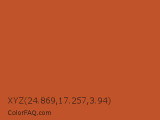 XYZ 24.869,17.257,3.94 Color is a normal orange color and the nearest color is Tuscany #bd5e2e. Hex code #bf5227 and RGB value is rgb(191,82,39). In RGB color space, this color is composed of 75% red, 32% green, 15% blue, In CMYK color space, this color is composed of 0% cyan, 57% magenta, 80% yellow , 25% black , In HSL color space, this color has a hue angle of 17° , 66% saturation and 45% lightness.