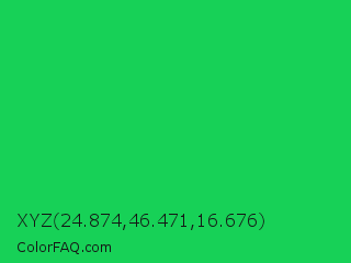 XYZ 24.874,46.471,16.676 Color is a normal green color and the nearest color is Malachite #0bda51. Hex code #17d157 and RGB value is rgb(23,209,87). In RGB color space, this color is composed of 9% red, 82% green, 34% blue, In CMYK color space, this color is composed of 89% cyan, 0% magenta, 58% yellow , 18% black , In HSL color space, this color has a hue angle of 141° , 80% saturation and 45% lightness.