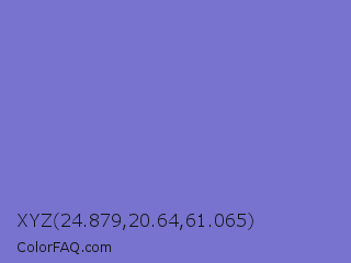 XYZ 24.879,20.64,61.065 Color is a light indigo color and the nearest color is Moody Blue #7f76d3. Hex code #7773ce and RGB value is rgb(119,115,206). In RGB color space, this color is composed of 47% red, 45% green, 81% blue, In CMYK color space, this color is composed of 42% cyan, 44% magenta, 0% yellow , 19% black , In HSL color space, this color has a hue angle of 243° , 48% saturation and 63% lightness.