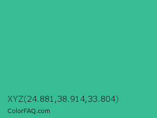 XYZ 24.881,38.914,33.804 Color is a normal green color and the nearest color is Mountain Meadow #30ba8f. Hex code #38bc93 and RGB value is rgb(56,188,147). In RGB color space, this color is composed of 22% red, 74% green, 58% blue, In CMYK color space, this color is composed of 70% cyan, 0% magenta, 22% yellow , 26% black , In HSL color space, this color has a hue angle of 161° , 54% saturation and 48% lightness.
