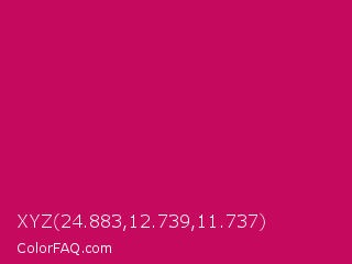 XYZ 24.883,12.739,11.737 Color is a normal rose color and the nearest color is Pictorial Carmine #c30b4e. Hex code #c4095e and RGB value is rgb(196,9,94). In RGB color space, this color is composed of 77% red, 4% green, 37% blue, In CMYK color space, this color is composed of 0% cyan, 95% magenta, 52% yellow , 23% black , In HSL color space, this color has a hue angle of 333° , 91% saturation and 40% lightness.