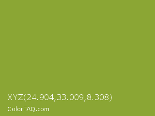 XYZ 24.904,33.009,8.308 Color is a normal lime color and the nearest color is Sushi #87ab39. Hex code #8ba634 and RGB value is rgb(139,166,52). In RGB color space, this color is composed of 55% red, 65% green, 20% blue, In CMYK color space, this color is composed of 16% cyan, 0% magenta, 69% yellow , 35% black , In HSL color space, this color has a hue angle of 74° , 52% saturation and 43% lightness.