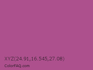 XYZ 24.91,16.545,27.08 Color is a normal magenta color and the nearest color is Tapestry #b05e81. Hex code #ad508d and RGB value is rgb(173,80,141). In RGB color space, this color is composed of 68% red, 31% green, 55% blue, In CMYK color space, this color is composed of 0% cyan, 54% magenta, 18% yellow , 32% black , In HSL color space, this color has a hue angle of 321° , 37% saturation and 50% lightness.