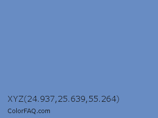 XYZ 24.937,25.639,55.264 Color is a normal blue color and the nearest color is Silver Lake Blue #5d89ba. Hex code #688cc3 and RGB value is rgb(104,140,195). In RGB color space, this color is composed of 41% red, 55% green, 76% blue, In CMYK color space, this color is composed of 47% cyan, 28% magenta, 0% yellow , 24% black , In HSL color space, this color has a hue angle of 216° , 43% saturation and 59% lightness.