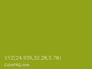 XYZ 24.939,32.28,5.78 Color is a normal yellow color and the nearest color is Citron #9fa91f. Hex code #91a318 and RGB value is rgb(145,163,24). In RGB color space, this color is composed of 57% red, 64% green, 9% blue, In CMYK color space, this color is composed of 11% cyan, 0% magenta, 85% yellow , 36% black , In HSL color space, this color has a hue angle of 68° , 74% saturation and 37% lightness.