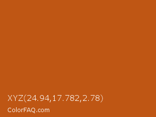 XYZ 24.94,17.782,2.78 Color is a normal orange color and the nearest color is Orange Roughy #c45719. Hex code #bf5614 and RGB value is rgb(191,86,20). In RGB color space, this color is composed of 75% red, 34% green, 8% blue, In CMYK color space, this color is composed of 0% cyan, 55% magenta, 90% yellow , 25% black , In HSL color space, this color has a hue angle of 23° , 81% saturation and 41% lightness.