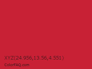 XYZ 24.956,13.56,4.551 Color is a normal red color and the nearest color is Cardinal #c41e3a. Hex code #c82034 and RGB value is rgb(200,32,52). In RGB color space, this color is composed of 78% red, 13% green, 20% blue, In CMYK color space, this color is composed of 0% cyan, 84% magenta, 74% yellow , 22% black , In HSL color space, this color has a hue angle of 353° , 72% saturation and 45% lightness.