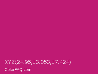 XYZ 24.95,13.053,17.424 Color is a normal rose color and the nearest color is Magenta Dye #ca1f7b. Hex code #bf1a73 and RGB value is rgb(191,26,115). In RGB color space, this color is composed of 75% red, 10% green, 45% blue, In CMYK color space, this color is composed of 0% cyan, 86% magenta, 40% yellow , 25% black , In HSL color space, this color has a hue angle of 328° , 76% saturation and 43% lightness.
