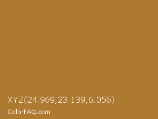 XYZ 24.969,23.139,6.056 Color is a normal orange color and the nearest color is Copper #b87333. Hex code #ae7a31 and RGB value is rgb(174,122,49). In RGB color space, this color is composed of 68% red, 48% green, 19% blue, In CMYK color space, this color is composed of 0% cyan, 30% magenta, 72% yellow , 32% black , In HSL color space, this color has a hue angle of 35° , 56% saturation and 44% lightness.