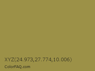 XYZ 24.973,27.774,10.006 Color is a normal yellow color and the nearest color is Sycamore #908d39. Hex code #9c9147 and RGB value is rgb(156,145,71). In RGB color space, this color is composed of 61% red, 57% green, 28% blue, In CMYK color space, this color is composed of 0% cyan, 7% magenta, 54% yellow , 39% black , In HSL color space, this color has a hue angle of 52° , 37% saturation and 45% lightness.