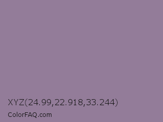 XYZ 24.99,22.918,33.244 Color is a normal purple color and the nearest color is Mamba #8e8190. Hex code #937c99 and RGB value is rgb(147,124,153). In RGB color space, this color is composed of 58% red, 49% green, 60% blue, In CMYK color space, this color is composed of 4% cyan, 19% magenta, 0% yellow , 40% black , In HSL color space, this color has a hue angle of 288° , 12% saturation and 54% lightness.