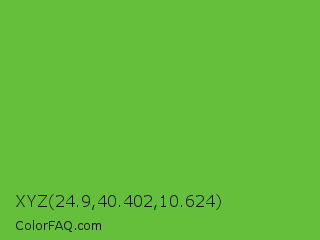 XYZ 24.9,40.402,10.624 Color is a normal green color and the nearest color is Green RYB #66b032. Hex code #66bf3b and RGB value is rgb(102,191,59). In RGB color space, this color is composed of 40% red, 75% green, 23% blue, In CMYK color space, this color is composed of 47% cyan, 0% magenta, 69% yellow , 25% black , In HSL color space, this color has a hue angle of 100° , 53% saturation and 49% lightness.