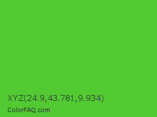 XYZ 24.9,43.781,9.934 Color is a normal green color and the nearest color is Harlequin Green #46cb18. Hex code #52c930 and RGB value is rgb(82,201,48). In RGB color space, this color is composed of 32% red, 79% green, 19% blue, In CMYK color space, this color is composed of 59% cyan, 0% magenta, 76% yellow , 21% black , In HSL color space, this color has a hue angle of 107° , 61% saturation and 49% lightness.