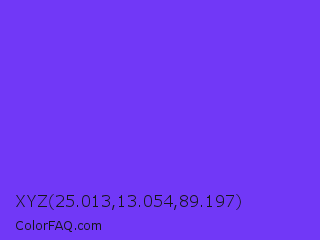 XYZ 25.013,13.054,89.197 Color is a normal indigo color and the nearest color is Blue Violet #8a2be2. Hex code #7138f7 and RGB value is rgb(113,56,247). In RGB color space, this color is composed of 44% red, 22% green, 97% blue, In CMYK color space, this color is composed of 54% cyan, 77% magenta, 0% yellow , 3% black , In HSL color space, this color has a hue angle of 258° , 92% saturation and 59% lightness.