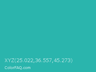 XYZ 25.022,36.557,45.273 Color is a normal cyan color and the nearest color is Light Sea Green #20b2aa. Hex code #2ab5ad and RGB value is rgb(42,181,173). In RGB color space, this color is composed of 16% red, 71% green, 68% blue, In CMYK color space, this color is composed of 77% cyan, 0% magenta, 4% yellow , 29% black , In HSL color space, this color has a hue angle of 177° , 62% saturation and 44% lightness.