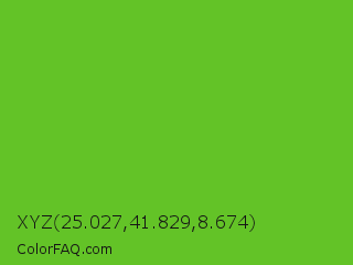 XYZ 25.027,41.829,8.674 Color is a normal green color and the nearest color is Green RYB #66b032. Hex code #63c327 and RGB value is rgb(99,195,39). In RGB color space, this color is composed of 39% red, 76% green, 15% blue, In CMYK color space, this color is composed of 49% cyan, 0% magenta, 80% yellow , 24% black , In HSL color space, this color has a hue angle of 97° , 67% saturation and 46% lightness.