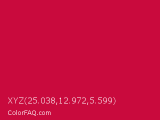 XYZ 25.038,12.972,5.599 Color is a normal rose color and the nearest color is Red NCS #c40233. Hex code #c90a3d and RGB value is rgb(201,10,61). In RGB color space, this color is composed of 79% red, 4% green, 24% blue, In CMYK color space, this color is composed of 0% cyan, 95% magenta, 70% yellow , 21% black , In HSL color space, this color has a hue angle of 344° , 91% saturation and 41% lightness.