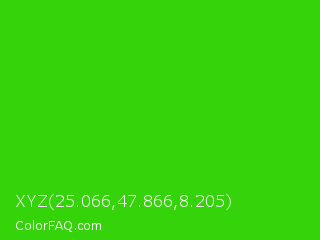 XYZ 25.066,47.866,8.205 Color is a normal green color and the nearest color is Harlequin Green #46cb18. Hex code #35d40a and RGB value is rgb(53,212,10). In RGB color space, this color is composed of 21% red, 83% green, 4% blue, In CMYK color space, this color is composed of 75% cyan, 0% magenta, 95% yellow , 17% black , In HSL color space, this color has a hue angle of 107° , 91% saturation and 44% lightness.
