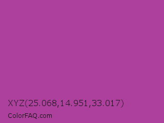 XYZ 25.068,14.951,33.017 Color is a normal magenta color and the nearest color is Byzantine #bd33a4. Hex code #ad409c and RGB value is rgb(173,64,156). In RGB color space, this color is composed of 68% red, 25% green, 61% blue, In CMYK color space, this color is composed of 0% cyan, 63% magenta, 10% yellow , 32% black , In HSL color space, this color has a hue angle of 309° , 46% saturation and 46% lightness.