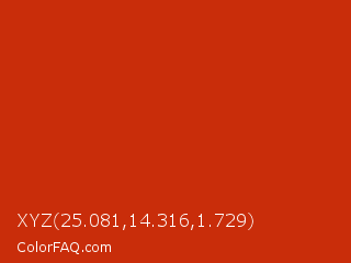 XYZ 25.081,14.316,1.729 Color is a normal red color and the nearest color is Thunderbird #c02b18. Hex code #c92d0a and RGB value is rgb(201,45,10). In RGB color space, this color is composed of 79% red, 18% green, 4% blue, In CMYK color space, this color is composed of 0% cyan, 78% magenta, 95% yellow , 21% black , In HSL color space, this color has a hue angle of 11° , 91% saturation and 41% lightness.