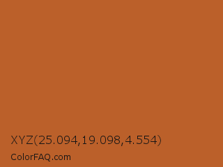 XYZ 25.094,19.098,4.554 Color is a normal orange color and the nearest color is Tuscany #bd5e2e. Hex code #bb602a and RGB value is rgb(187,96,42). In RGB color space, this color is composed of 73% red, 38% green, 16% blue, In CMYK color space, this color is composed of 0% cyan, 49% magenta, 78% yellow , 27% black , In HSL color space, this color has a hue angle of 22° , 63% saturation and 45% lightness.
