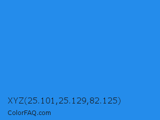 XYZ 25.101,25.129,82.125 Color is a normal blue color and the nearest color is Bleu De France #318ce7. Hex code #248ceb and RGB value is rgb(36,140,235). In RGB color space, this color is composed of 14% red, 55% green, 92% blue, In CMYK color space, this color is composed of 85% cyan, 40% magenta, 0% yellow , 8% black , In HSL color space, this color has a hue angle of 209° , 83% saturation and 53% lightness.