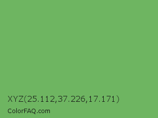 XYZ 25.112,37.226,17.171 Color is a normal green color and the nearest color is Bud Green #7bb661. Hex code #6eb561 and RGB value is rgb(110,181,97). In RGB color space, this color is composed of 43% red, 71% green, 38% blue, In CMYK color space, this color is composed of 39% cyan, 0% magenta, 46% yellow , 29% black , In HSL color space, this color has a hue angle of 111° , 36% saturation and 55% lightness.