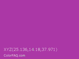 XYZ 25.136,14.18,37.971 Color is a normal magenta color and the nearest color is Byzantine #bd33a4. Hex code #ab37a7 and RGB value is rgb(171,55,167). In RGB color space, this color is composed of 67% red, 22% green, 65% blue, In CMYK color space, this color is composed of 0% cyan, 68% magenta, 2% yellow , 33% black , In HSL color space, this color has a hue angle of 302° , 51% saturation and 44% lightness.