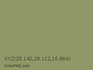 XYZ 25.142,29.112,16.864 Color is a normal yellow color and the nearest color is Moss Green #8a9a5b. Hex code #919766 and RGB value is rgb(145,151,102). In RGB color space, this color is composed of 57% red, 59% green, 40% blue, In CMYK color space, this color is composed of 4% cyan, 0% magenta, 32% yellow , 41% black , In HSL color space, this color has a hue angle of 67° , 19% saturation and 50% lightness.