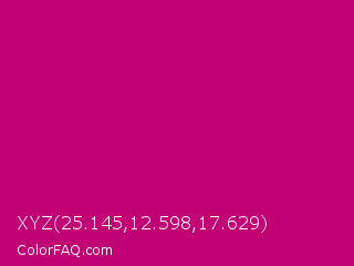XYZ 25.145,12.598,17.629 Color is a normal magenta color and the nearest color is Red Violet #c71585. Hex code #c10074 and RGB value is rgb(193,0,116). In RGB color space, this color is composed of 76% red, 0% green, 45% blue, In CMYK color space, this color is composed of 0% cyan, 100% magenta, 40% yellow , 24% black , In HSL color space, this color has a hue angle of 324° , 100% saturation and 38% lightness.