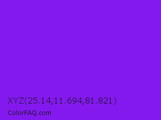 XYZ 25.14,11.694,81.821 Color is a normal violet color and the nearest color is Blue Violet #8a2be2. Hex code #8319ee and RGB value is rgb(131,25,238). In RGB color space, this color is composed of 51% red, 10% green, 93% blue, In CMYK color space, this color is composed of 45% cyan, 89% magenta, 0% yellow , 7% black , In HSL color space, this color has a hue angle of 270° , 86% saturation and 52% lightness.
