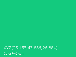 XYZ 25.155,43.886,26.884 Color is a normal green color and the nearest color is Mountain Meadow Crayola #1ab385. Hex code #13ca7e and RGB value is rgb(19,202,126). In RGB color space, this color is composed of 7% red, 79% green, 49% blue, In CMYK color space, this color is composed of 91% cyan, 0% magenta, 38% yellow , 21% black , In HSL color space, this color has a hue angle of 155° , 83% saturation and 43% lightness.