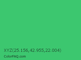 XYZ 25.156,42.955,22.004 Color is a normal green color and the nearest color is UFO Green #3cd070. Hex code #3cc76f and RGB value is rgb(60,199,111). In RGB color space, this color is composed of 24% red, 78% green, 44% blue, In CMYK color space, this color is composed of 70% cyan, 0% magenta, 44% yellow , 22% black , In HSL color space, this color has a hue angle of 142° , 55% saturation and 51% lightness.