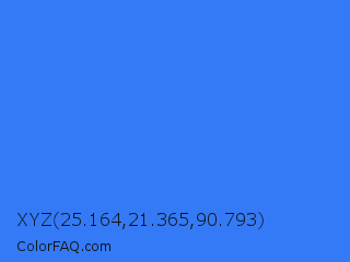 XYZ 25.164,21.365,90.793 Color is a normal blue color and the nearest color is Blue Crayola #1f75fe. Hex code #347af7 and RGB value is rgb(52,122,247). In RGB color space, this color is composed of 20% red, 48% green, 97% blue, In CMYK color space, this color is composed of 79% cyan, 51% magenta, 0% yellow , 3% black , In HSL color space, this color has a hue angle of 218° , 92% saturation and 59% lightness.