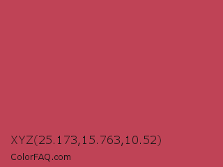 XYZ 25.173,15.763,10.52 Color is a normal red color and the nearest color is Brick Red #cb4154. Hex code #bf4356 and RGB value is rgb(191,67,86). In RGB color space, this color is composed of 75% red, 26% green, 34% blue, In CMYK color space, this color is composed of 0% cyan, 65% magenta, 55% yellow , 25% black , In HSL color space, this color has a hue angle of 351° , 49% saturation and 51% lightness.