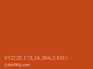 XYZ 25.173,16.304,2.631 Color is a normal orange color and the nearest color is Tia Maria #c1440e. Hex code #c44717 and RGB value is rgb(196,71,23). In RGB color space, this color is composed of 77% red, 28% green, 9% blue, In CMYK color space, this color is composed of 0% cyan, 64% magenta, 88% yellow , 23% black , In HSL color space, this color has a hue angle of 17° , 79% saturation and 43% lightness.