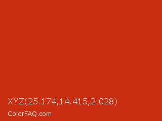 XYZ 25.174,14.415,2.028 Color is a normal red color and the nearest color is Thunderbird #c02b18. Hex code #c92e12 and RGB value is rgb(201,46,18). In RGB color space, this color is composed of 79% red, 18% green, 7% blue, In CMYK color space, this color is composed of 0% cyan, 77% magenta, 91% yellow , 21% black , In HSL color space, this color has a hue angle of 9° , 84% saturation and 43% lightness.