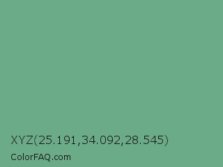 XYZ 25.191,34.092,28.545 Color is a normal green color and the nearest color is Silver Tree #66b58f. Hex code #6cab88 and RGB value is rgb(108,171,136). In RGB color space, this color is composed of 42% red, 67% green, 53% blue, In CMYK color space, this color is composed of 37% cyan, 0% magenta, 20% yellow , 33% black , In HSL color space, this color has a hue angle of 147° , 27% saturation and 55% lightness.