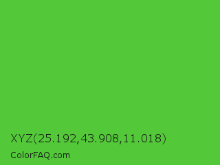XYZ 25.192,43.908,11.018 Color is a normal green color and the nearest color is Green RYB #66b032. Hex code #53c939 and RGB value is rgb(83,201,57). In RGB color space, this color is composed of 33% red, 79% green, 22% blue, In CMYK color space, this color is composed of 59% cyan, 0% magenta, 72% yellow , 21% black , In HSL color space, this color has a hue angle of 109° , 57% saturation and 51% lightness.