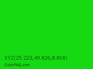 XYZ 25.223,49.826,8.818 Color is a normal green color and the nearest color is Vivid Malachite #00cc33. Hex code #15d911 and RGB value is rgb(21,217,17). In RGB color space, this color is composed of 8% red, 85% green, 7% blue, In CMYK color space, this color is composed of 90% cyan, 0% magenta, 92% yellow , 15% black , In HSL color space, this color has a hue angle of 119° , 85% saturation and 46% lightness.