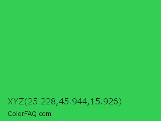 XYZ 25.228,45.944,15.926 Color is a normal green color and the nearest color is UFO Green #3cd070. Hex code #32cf54 and RGB value is rgb(50,207,84). In RGB color space, this color is composed of 20% red, 81% green, 33% blue, In CMYK color space, this color is composed of 76% cyan, 0% magenta, 59% yellow , 19% black , In HSL color space, this color has a hue angle of 133° , 62% saturation and 50% lightness.