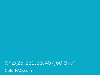 XYZ 25.231,33.407,60.377 Color is a normal cyan color and the nearest color is Cerulean #02a4d3. Hex code #0aabc9 and RGB value is rgb(10,171,201). In RGB color space, this color is composed of 4% red, 67% green, 79% blue, In CMYK color space, this color is composed of 95% cyan, 15% magenta, 0% yellow , 21% black , In HSL color space, this color has a hue angle of 189° , 91% saturation and 41% lightness.