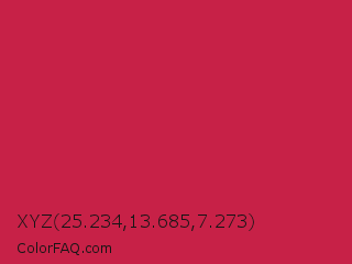 XYZ 25.234,13.685,7.273 Color is a normal red color and the nearest color is Maroon Flush #c32148. Hex code #c72147 and RGB value is rgb(199,33,71). In RGB color space, this color is composed of 78% red, 13% green, 28% blue, In CMYK color space, this color is composed of 0% cyan, 83% magenta, 64% yellow , 22% black , In HSL color space, this color has a hue angle of 346° , 72% saturation and 45% lightness.