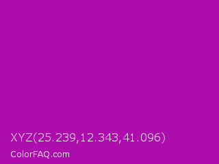 XYZ 25.239,12.343,41.096 Color is a normal magenta color and the nearest color is Heliotrope Magenta #aa00bb. Hex code #ae0dae and RGB value is rgb(174,13,174). In RGB color space, this color is composed of 68% red, 5% green, 68% blue, In CMYK color space, this color is composed of 0% cyan, 93% magenta, 0% yellow , 32% black , In HSL color space, this color has a hue angle of 300° , 86% saturation and 37% lightness.