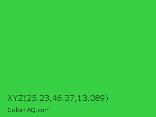 XYZ 25.23,46.37,13.089 Color is a normal green color and the nearest color is Lime Green #32cd32. Hex code #38d044 and RGB value is rgb(56,208,68). In RGB color space, this color is composed of 22% red, 82% green, 27% blue, In CMYK color space, this color is composed of 73% cyan, 0% magenta, 67% yellow , 18% black , In HSL color space, this color has a hue angle of 125° , 62% saturation and 52% lightness.