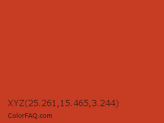 XYZ 25.261,15.465,3.244 Color is a normal red color and the nearest color is Dark Pastel Red #c23b22. Hex code #c63d23 and RGB value is rgb(198,61,35). In RGB color space, this color is composed of 78% red, 24% green, 14% blue, In CMYK color space, this color is composed of 0% cyan, 69% magenta, 82% yellow , 22% black , In HSL color space, this color has a hue angle of 10° , 70% saturation and 46% lightness.